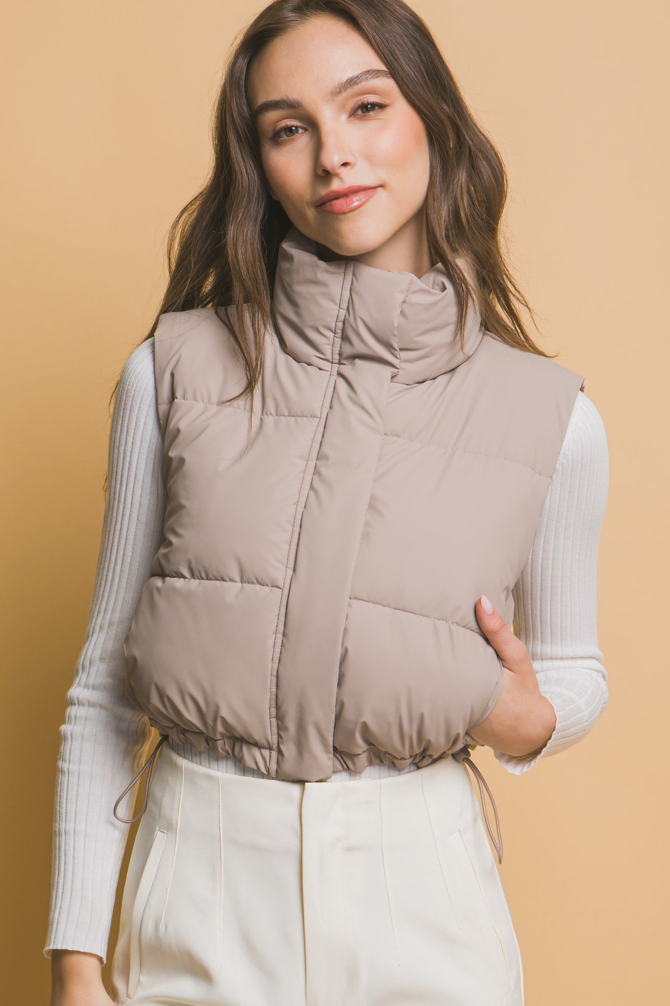 Stay stylish and warm with this high neck cropped puffer vest featuring convenient snap and zipper closures for easy wear. The cinched waist enhances your silhouette, while the two pockets add practicality for carrying essentials. Crafted from non-stretch fabric, this vest offers a structured fit perfect for layering during chilly days.