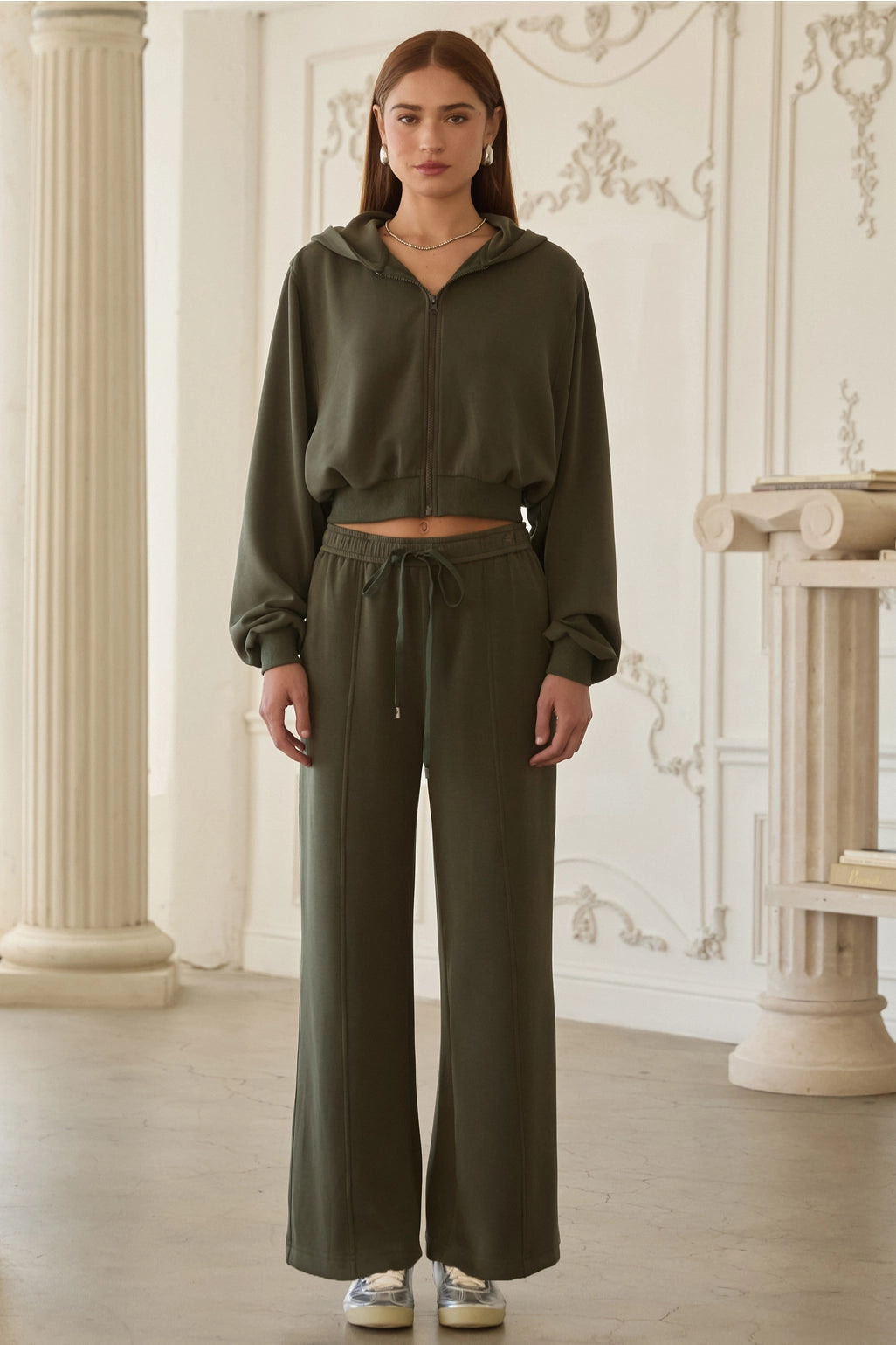 Discover effortless comfort with this versatile modal two-piece set. The soft, breathable fabric drapes beautifully while the adjustable drawstring waist and zip-up hood provide the perfect blend of style and functionality. Ideal for lounging or running errands, this set keeps you cozy without compromising on sophistication.